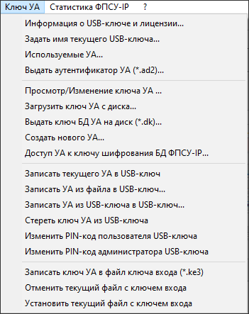 Для управления ключами УА, записанными в VPN-Key/UA, следует использовать следующие команды меню «Ключ УА»: