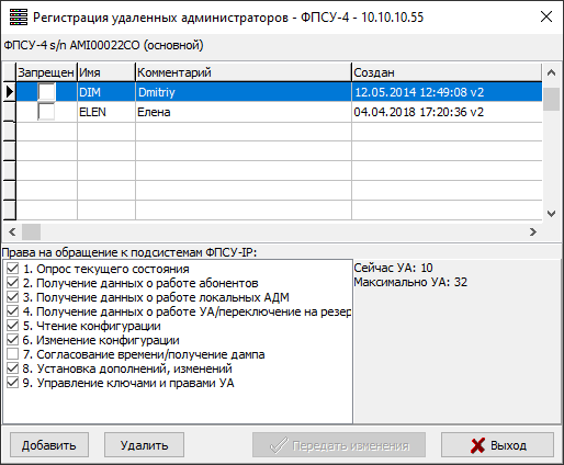 2. Откроется меню с командами ручного управления ФПСУ-IP. В разделе «Управление ФПСУ-IP» следует выбрать команду «Редактировать УА», откроется окно регистрации удаленных администраторов.