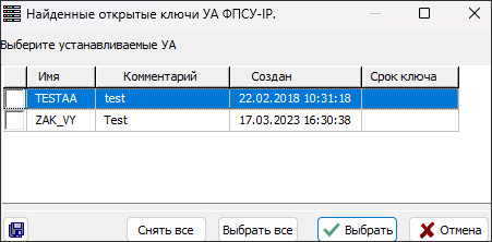 На экран будет выдано окно с найденными открытыми ключами администратора УА ФПСУ-IP.