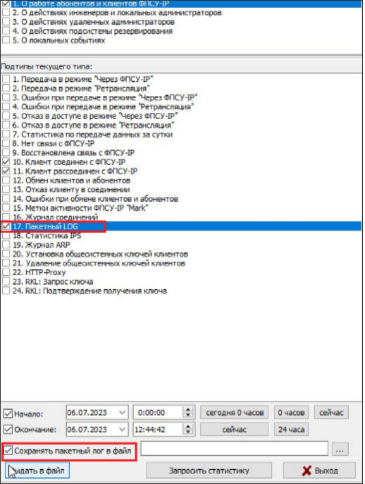 Для получения пакетного лога в настройках ФПСУ-IP следует: •снять ограничения регистрации для каждого обработанного межсетевым экраном пакета отдельной записи («Пакетный LOG», см. п. «Ограничение сбора статистики» документа «Криптомаршрутизатор и межсетевой экран ФПСУ-Аmigo версии 4»); •включить логирование (вести Лог, писать заголовки пакетов - см. п. «Общие настройки правил трафика» документа «ФПСУ-Аmigo версии 4»конкретном правиле (в нашем случае с клиентом) включить логирование. В УА ФПСУ-IP в окне «Статистика» необходимо установить флаги, позволяющие получить лог через УА: •тип 1 п. 17 - «Пакетный LOG»; •«Сохранять пакетный лог в файл»: