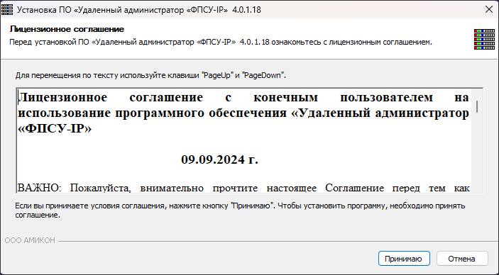2. Первое окно установки УА ФПСУ-IP содержит лицензионное соглашение. В случае несогласия следует нажать кнопку «Отмена» для прекращения установки. Для продолжения установки необходимо нажать кнопку «Принимаю»;