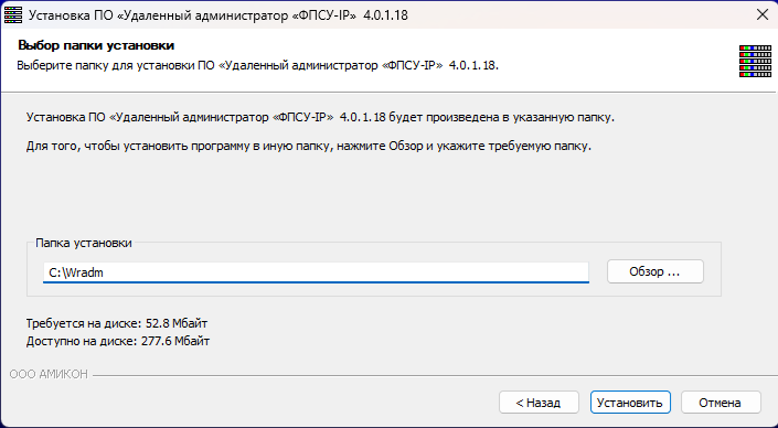 5. Для запуска процесса установки УА ФПСУ-IP необходимо нажать кнопку «Установить» в окне выбора каталога.