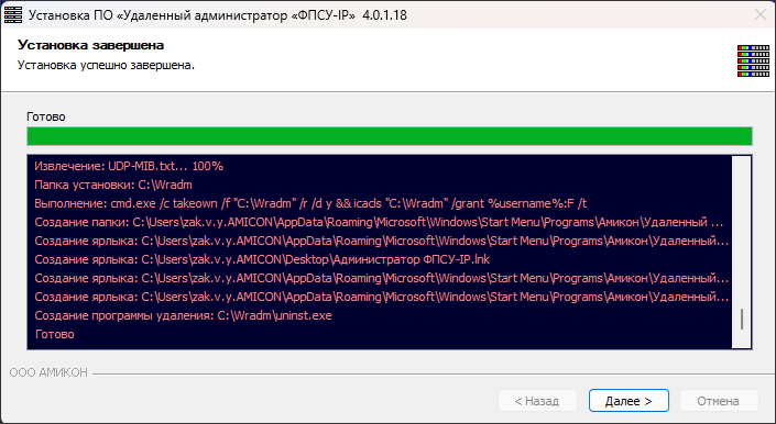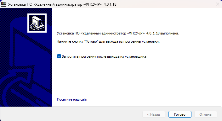 Для завершения установки необходимо нажать кнопку «Далее» и в открывшемся окне подтвердить завершение установки нажатием кнопки «Готово».