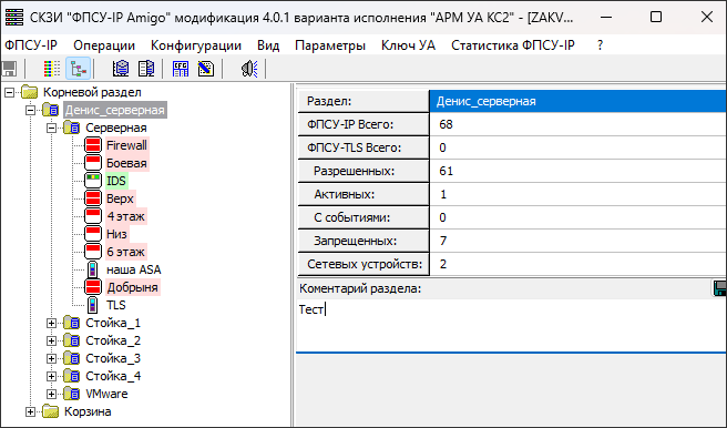 Если в списке выбран раздел, то панель информации отображает название раздела, произвольный текстовый комментарий к разделу, и сводные данные по ФПСУ-IP, которые находятся в разделе: