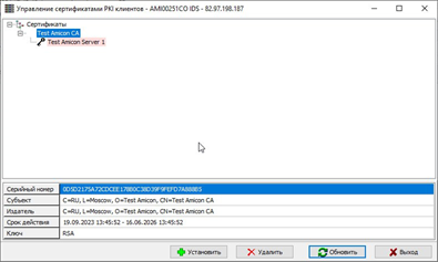 В окне управления PKI сертификатами предоставляется возможность установить новый сертификат, удалить уже добавленный, а так же обновить информацию по сертификатам путем использования одноименных кнопок. |