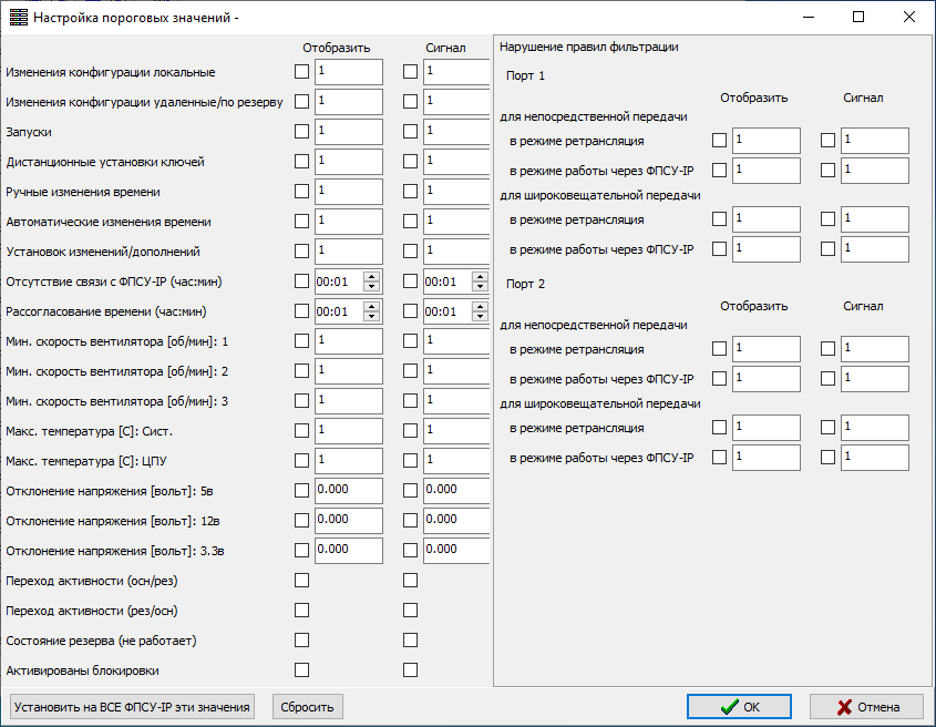 Кнопка «Установить на ВСЕ ФПСУ-IP эти значения» устанавливает выставленные параметры пороговых значений на все ФПСУ-IP, зарегистрированные в УА ФПСУ-IP. Внимание! Такая установка перезапишет ранее произведенные индивидуальные настройки на всех ФПСУ-IP! Кнопка «Сбросить» снимает отметки о всех событиях в данном окне. |