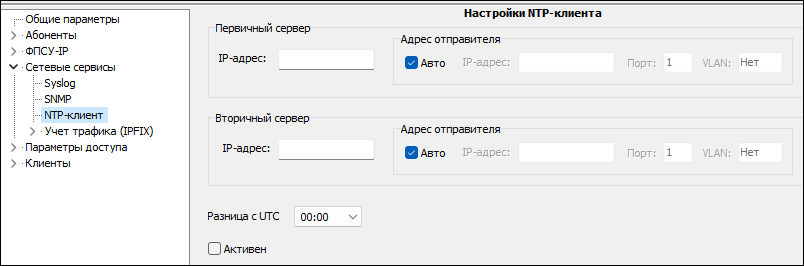 На ФПСУ-IP может быть установлен режим автоматической синхронизации текущего времени с одним из задаваемых тайм-серверов, работающих по протоколу NTP. NTP-клиент на ФПСУ-IP поддерживает синхронизацию с двумя NTP-серверами, которые указываются как «первичный» и «вторичный» в интерфейсе ФПСУ-IP. Синхронизация со вторичным сервером включается при недоступности первичного. ВНИМАНИЕ! НЕ СЛЕДУЕТ одновременно задействовать NTP-клиента и синхронизацию времени на ФПСУ-IP с удаленным администратором (см. пункт «Установка параметров взаимодействия ФПСУ-IP с УА ФПСУ-IP»)! Настройка синхронизации времени выполняется из пункта «Сетевые сервисы→ NTP-клиент» окна изменения конфигурации ФПСУ-IP по шаблону: