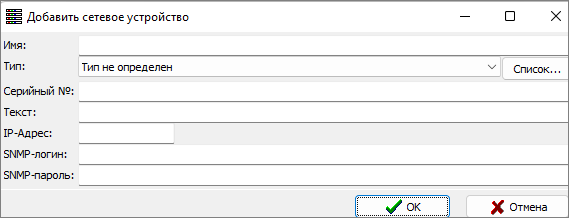 В открывшемся окне добавления необходимо ввести наименование сетевого устройства. Опционально добавляется информация о: •серийном номере сетевого устройства; •IP-адресе сетевого устройства; •логине для SNMP-запроса; •пароле для SNMP-запроса; •типе сетевого устройства (с возможностью добавления нового). Список типов сетевых устройств можно составить двумя способами: 1.Выполнив команду главного меню УА ФПСУ-IP «Операции» → «Типы сетевых устройств». 2.Нажав кнопку «Список...» в окне добавления сетевых устройств (см. раздел «Добавление сетевого устройства»)