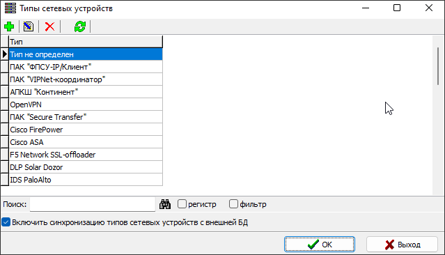 В открывшемся окне предоставляется возможность добавить новый тип сетевого устройства, отредактировать его наименование или удалить из общего списка. Так же предоставляется возможность синхронизировать список типов сетевых устройств со списком, хранящимся во внешней БД. По нажатию кнопки «ОК» сетевое устройство будет добавлено в корневой раздел списка ФПСУ-IP. Для сетевых устройств предусмотрено контекстное меню, вызываемое нажатием правой клавишей мыши: