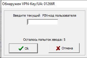 Все изменения, производимые в этой вкладке, необходимо сохранять путем нажатия на кнопку «Сохранить изменения». Нажатием кнопки «Добавить УА из VPN-Key/UA» инициируется предоставление доступа к базе данных учетной записи пользователя УА ФПСУ-IP, чей VPN-Key сейчас подключен к УА ФПСУ-IP. Для того, чтобы создать нового профиль нового пользователя УА ФПСУ-IP при помощи устройства VPN-Key/UA, необходимо подключить устройство VPN-Key/UA и нажать кнопку «Добавить УА из VPN-Key/UA». Система выдаст сообщение об обнаруженном VPN-Key/UA и запрос на ввод текущего PIN-кода пользователя УА ФПСУ-IP: