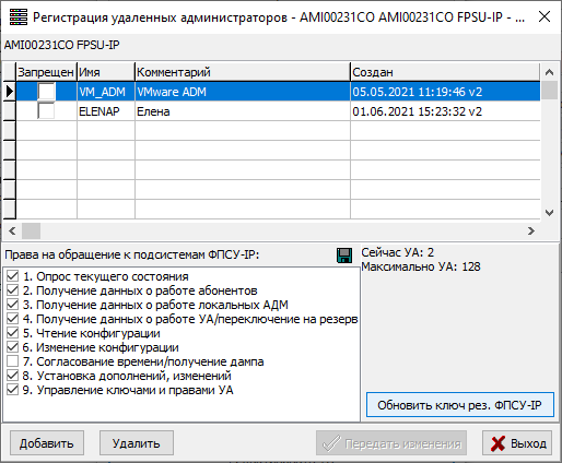 Чтобы зарегистрировать резервный ФПСУ-IP в УА, необходимо предварительно зарегистрировать основной ФПСУ-IP (см. пункт «Регистрация открытого ключа ФПСУ-IP в УА ФПСУ-IP»). Для регистрации открытого ключа резервного ФПСУ-IP в УА по открытому ключу основного необходимо: Выбрать ФПСУ-IP в списке и вызвать команду контекстного меню «Ручное управление» → «Редактирование УА». Если резервный ФПСУ-IP ранее не был зарегистрирован, в открывшемся окне внизу справа будет присутствовать кнопка «Обновить ключ рез. ФПСУ-IP».