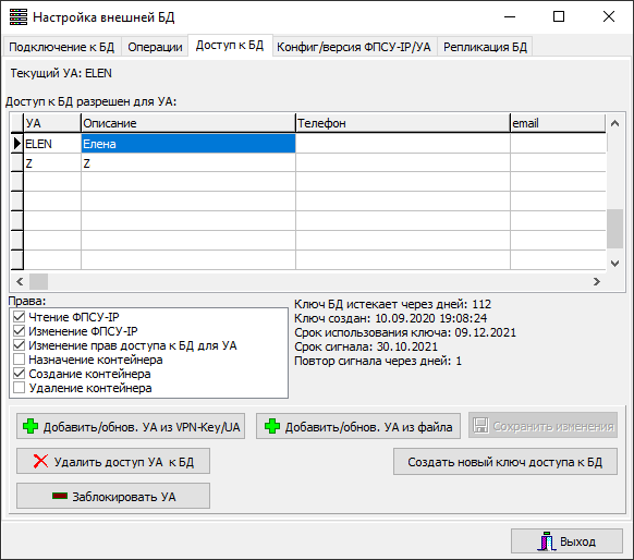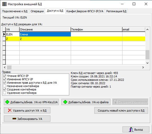 В информационном окне требуется нажать кнопку «ОК». На вкладке «Доступ к БД» обновится информация о ключе доступа ко внешней БД. Администратор внешней БД, производивший смену ключа доступа ко внешней БД, в списке администраторов будет отображаться белой строкой. Строки остальных администраторов внешней БД в списке будут отображаться желтым цветом. Всех администраторов УА в списке необходимо перерегистрировать (кроме текущего, который выполнил смену ключа доступа ко внешней БД).