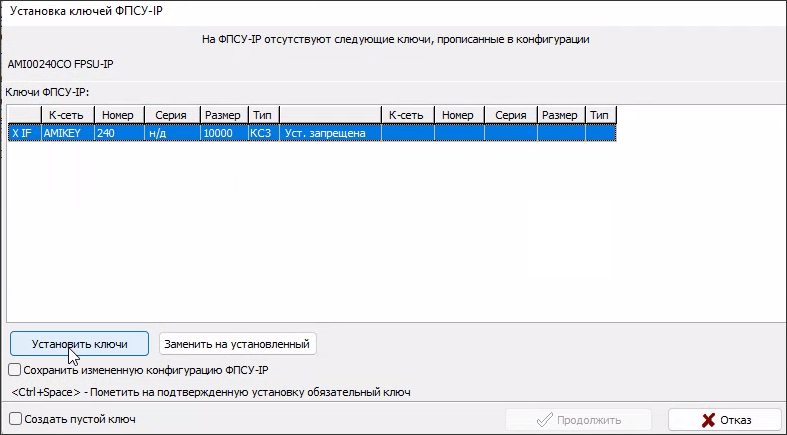 В данном окне будут отображен список ключей, помеченных в первой колонке следующими флагами: •"ХI" - установка обязательна; •"+" - установка выполнена; •"F" - запрещен к установке; •"S" - подтвержденная установка запрещенного и обязательного ключа (флаг появляется в том случае, если ключ запрещен к установке, но при этом был установлен; для пометки такого ключа на этапе выбора используется комбинация клавиш Ctrl+Space, после чего запрещенный к установке ключ может быть установлен). Новый ключ будет отмечен как обязательный для установки "XI"(используется в конфигурации) и запрещенный "F"(на ФПСУ-IP уже установлен ключ с другим номером). Выбранный ключ можно установить (нажатием одноименной кнопки), оставить ключ без изменений (нажатием кнопки «Заменить на установленный»), а так же создать пустой ключ и/или сохранить измененную конфигурацию на ФПСУ-IP (путем установки одноименных флагов). Все действия подтверждаются нажатием кнопки «Продолжить».