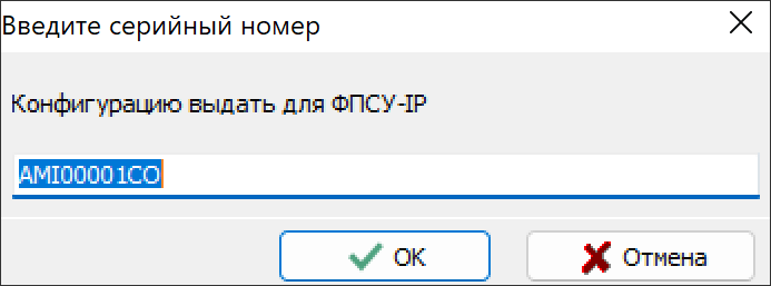 После ввода в одноименное поле нового номера ключа конфигурацию можно сохранить в виде файла (по нажатию кнопки «Выдать кфг. в файл» на экран будет выведено окно ввода серийного номера ФПСУ-IP, для которого выдается конфигурация):