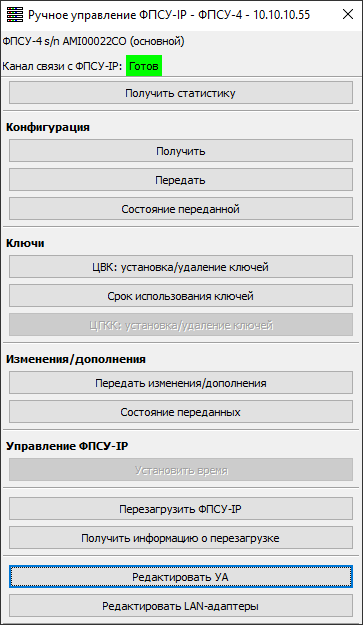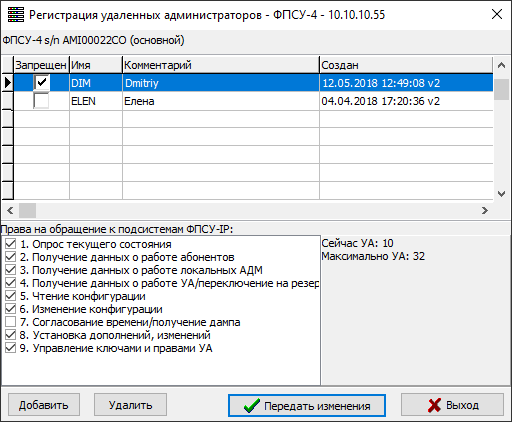 2. Откроется меню с командами ручного управления ФПСУ-IP. В разделе «Управление ФПСУ-IP» следует выбрать команду «Редактировать УА», откроется окно регистрации удаленных администраторов.
