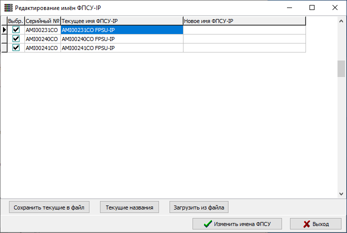Изменяемое имя ФПСУ-IP вносится в столбец «Новое имя ФПСУ-IP», после чего требуется подтвердить вносимые изменения нажатием кнопки «Изменить имена ФПСУ-IP». При подтверждении изменения серийный номер и текущее имя ФПСУ-IP подцвечиваются оранжевым цветом. Измененная запись подцвечивается желтым цветом. Для отмены внесенных изменений следует нажать кнопку «Выход». Используемые в списке зарегистрированных ФПСУ-IP имена можно сохранить в текстовый файл, нажав кнопку «Сохранить текущие в файл». Имена зарегистрированных ФПСУ-IP можно загрузить из текстового файла, нажав кнопку «Загрузить из файла». Текущее имя ФПСУ-IP отображается столбце «Новое имя ФПСУ-IP» по нажатию кнопки «Текущие названия». |