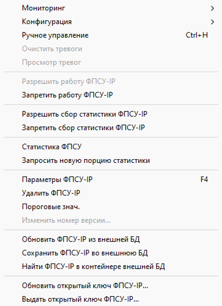 •«Параметры ФПСУ-IP» - переход к окну настройки параметров взаимодействия УА ФПСУ-IP и выбранного ФПСУ-IP, горячая клавиша для этой команды «F4»;