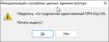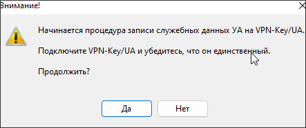После подключения к USB-порту VPN-Key/UA, который будет выполнять роль запасного, необходимо подтвердить начало выполнения инициализации копии ключа, нажав кнопку «Да». Для подтверждения создания дубликата ключа необходимо нажать кнопку «Да» в новом служебном окне: