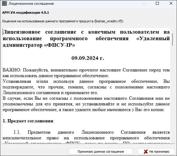 Первый запуск ПО сопровождается выводом на экран окна с лицензионным соглашением. В случае несогласия следует нажать кнопку «Не принимаю» для прекращения работы. Для продолжения работы необходимо нажать кнопку «Принимаю данное соглашение».