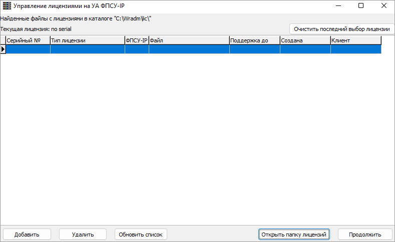 После нажатия кнопки «ОК» откроется окно управления лицензиями на УА ФПСУ-IP: