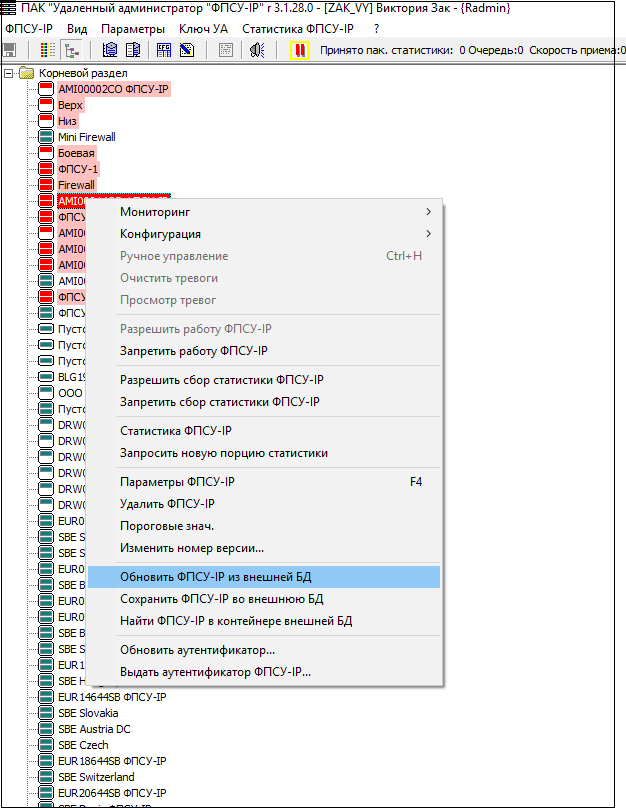 Для того, чтобы обновить параметры одного ФПСУ-IP в соответствии со сведениями, сохраненными во внешней БД, необходимо выбрать запись в общем списке основного окна программы и из выпадающего по нажатию правой клавиши мыши списка выбрать пункт «Обновить ФПСУ-IP из внешней БД».