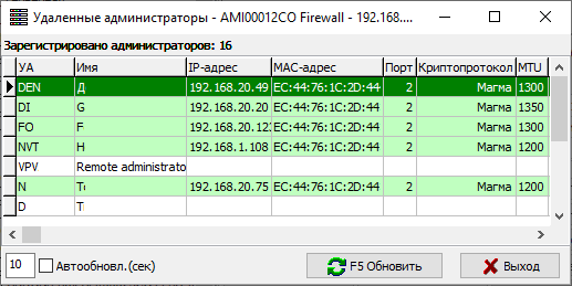 Для получения информации об администраторах УА ФПСУ-IP, зарегистрированных на выбранном в окне списка ФПСУ-IP, следует нажать кнопку «Удаленные АДМ» панели команд. Когда соединение будет установлено, на экран будет выдано окно, отображающее текущее состояние и результаты последних действий администраторов УА ФПСУ-IP. Чтобы обновить полученные от ФПСУ-IP сведения, необходимо нажать кнопку «F5 Обновить» или установить флаг «Автообновление», указав интервал времени, через который будут производиться повторные запросы.