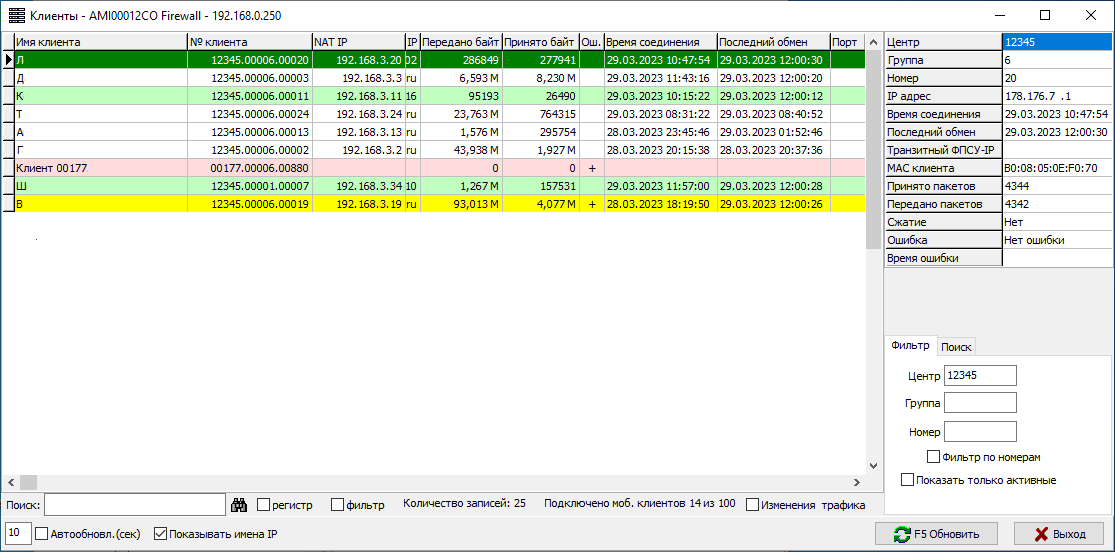 Чтобы обновить полученные от ФПСУ-IP сведения, следует нажать кнопку «F5 Обновить» или установить флаг «Автообновление», указав интервал времени, через который будут производиться повторные запросы. Осуществляется фильтрация по составному номеру клиента. Подцветка клиентов в списке означает следующее: •красный цвет - невозможность соединения ввиду ошибки/ошибок; •желтый - наличие установленного соединения с ошибкой; •зеленый - установленное соединение с клиентом; •белый - клиент отсоединен. Установка флага «Показать только активные» приводит к тому, что в интерфейсе просмотра данных ФПСУ-IP/Клиентов, передаваемых через ФПСУ-IP, запрашиваются и отображаются данные только тех клиентов, которые в настоящий момент соединены с ФПСУ-IP. Эта настройка аналогична описанной в пункте «Дополнительные настройки интерфейса УА ФПСУ-IP». Следует учитывать, что в случае отображения всех клиентов в списке, отсоединенные клиенты будут показываться до момента перезагрузки ФПСУ-IP. |