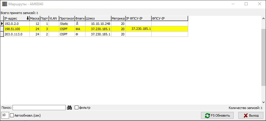 Для того чтобы просмотреть маршруты соединения ФПСУ-IP, необходимо выбрать ФПСУ-IP в списке главного окна УА ФПСУ-IP и нажать кнопку «Маршруты» панели команд. Данная опция доступна для ФПСУ-IP начиная с версии 4.