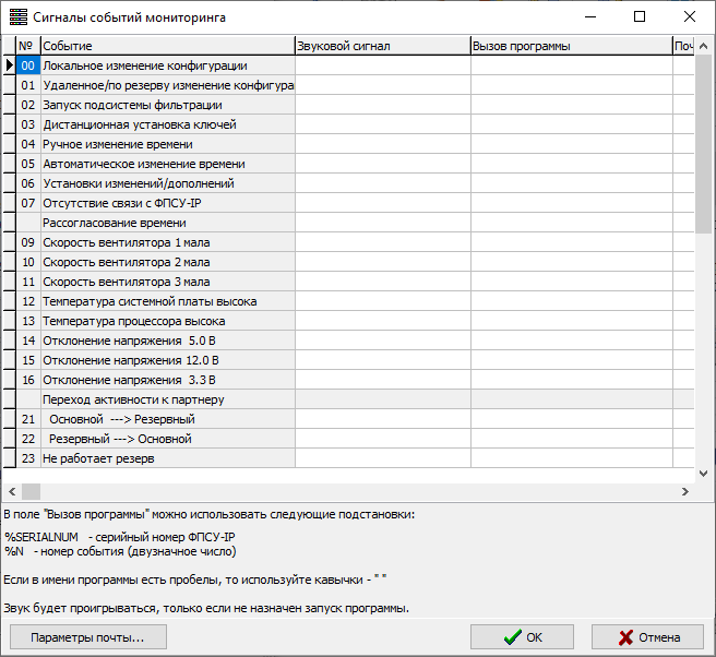 УА ФПСУ-IP позволяет для каждого вида событий на ФПСУ-IP назначить разные оповещения: уникальный звуковой сигнал, запуск указанной программы, отправку сообщения на почту. Для установки типов сигналов необходимо выполнить команду главного меню «Параметры → Сигналы пороговых значений...». На экране монитора появится окно «Сигналы событий мониторинга», содержащее список событий, идентичный списку из окна «Настройка пороговых значений».