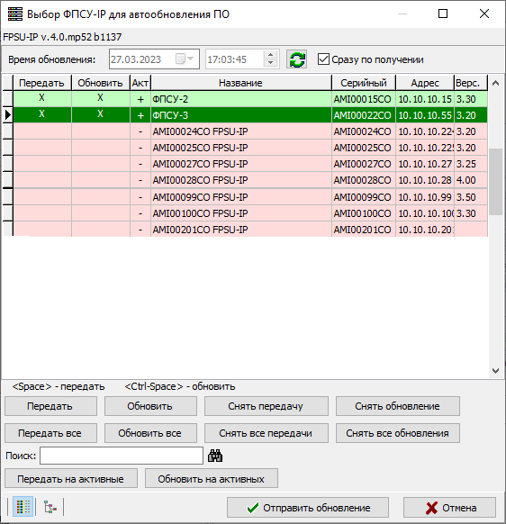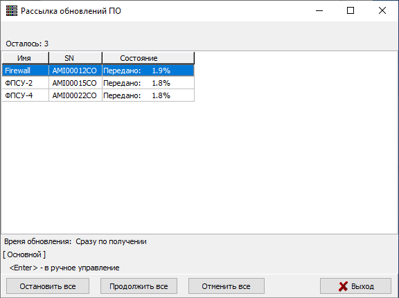 Если изменения ПО рассылаются всем ФПСУ-IP из списка, следует воспользоваться кнопками «Передать все» и «Обновить все». Когда все установки произведены, необходимо нажать кнопку «Отправить обновление». Появится окно выполнения рассылки обновлений ПО, в котором будет отображаться список тех ФПСУ-IP, на которых передача обновлений была запланирована, но еще не окончена: