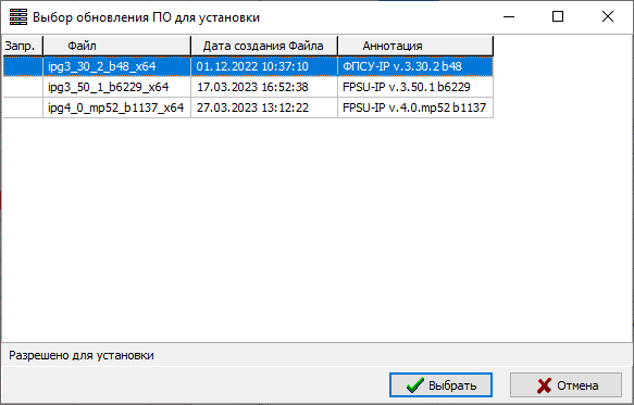 Передача изменений и дополнений программного обеспечения на множество ФПСУ-IP сразу может быть запланирована на УА ФПСУ-IP для выполнения в фоновом режиме. В этом случае формируется пакет рассылок, которые передаются указанным ФПСУ-IP во время установки туннелей. Для создания задачи пакетной загрузки необходимо выполнить команду главного меню УА ФПСУ-IP «Операции» → «Рассылка обновления ПО». На экран будет выдано окно выбора каталога, содержащего ПО для передачи, как и в случае установки обновления на единственный ФПСУ-IP, в котором необходимо указать путь к каталогу с файлом обновления ПО. Так же, как и в случае обновления ПО на одном ФПСУ-IP, необходимо выбрать из списка найденных в каталоге обновлений одно, которое требуется разослать на несколько ФПСУ-IP.
