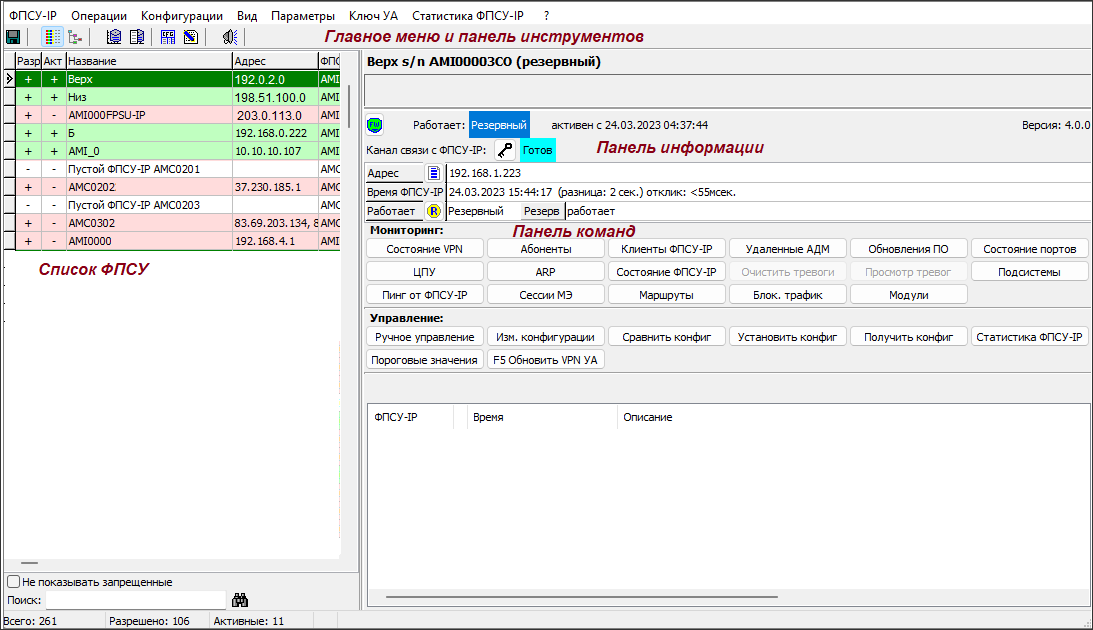 •главное меню и панель инструментов в верхней части основного окна (см. пункты «Главное меню УА ФПСУ-IP» и «Панель инструментов»);