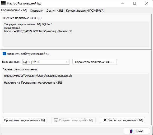 Дальнейшие действия с ключом производит администратор внешней БД ФПСУ-IP. После того, как администратор УА ФПСУ-IP зарегистрирован в внешней БД, на УА ФПСУ-IP требуется настроить доступ к файлу внешней БД. На панели информации следует нажать кнопку