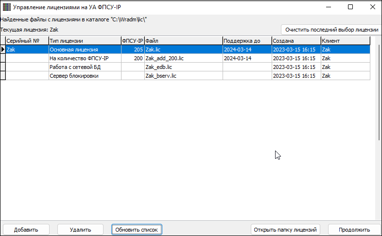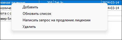 В открывшемся окне предоставляется возможность добавить или удалить лицензию по нажатию соответствующей кнопки. Кроме того, можно обновить список лицензий или открыть каталог «LIC» для работы непосредственно в нем. Добавить, удалить лицензию, а также обновить список лицензий можно при помощи контекстного меню окна «Управление лицензиями». Для этого необходимо выбрать лицензию в окне «Управление лицензиями», нажать на ней правой клавишей мыши и выбрать необходимый пункт контекстного меню.