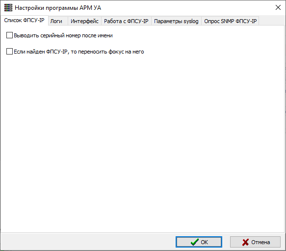 Установленный флаг «Выводить серийный номер после имени» добавляет к отображаемому имени зарегистрированного ФПСУ-IP его серийный номер. При снятом флаге в окне списка отображаются имена ФПСУ-IP, заданные по умолчанию, или переименованные администратором УА ФПСУ-IP. Переключатель «Если найден ФПСУ-IP, то переносить фокус на него» относится к работе панели поиска основного окна УА ФПСУ-IP. Во включенном состоянии при выполнении поиска, переключатель переносит активный курсор выбора строки в поле списка на найденный ФПСУ-IP. |