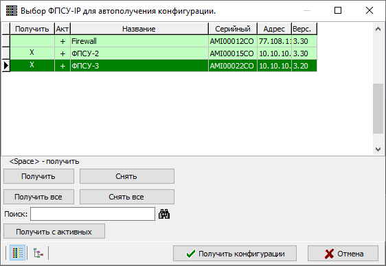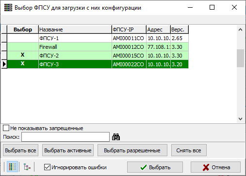 Загрузка конфигураций более чем с одного ФПСУ-IP возможна двумя способами — массовая и фоновая загрузка конфигураций, обе опции доступны из окна выбора конфигураций ФПСУ-IP, которое открывается при выборе последовательности команд «Конфигурации» → «Список конфигураций ФПСУ-IP», либо нажатием комбинации клавиш <Ctrl+L>. Окно управления массовой загрузкой конфигураций сразу с нескольких ФПСУ-IP вызывается по кнопке «Массовая загрузка кфг» из окна выбора конфигураций ФПСУ-IP. Администратор может отметить знаком [X] ФПСУ-IP из списка. Задание на загрузку конфигураций с отмеченных ФПСУ-IP устанавливается нажатием кнопки <Загрузить>, в результате чего УА ФПСУ-IP начнет последовательно устанавливать соединения с отмеченными ФПСУ-IP и загружать с них конфигурации в локальную базу данных.