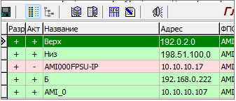 В левой части основного окна находится список зарегистрированных ФПСУ-IP, которые могут отображаться как в виде простого списка, так и в виде иерархического дерева. При отображении ФПСУ-IP в виде списка, выводится на экран информация о названии ФПСУ-IP, состоянии разрешения работы ФПСУ-IP (знак «+» или «-» в графе «Разр.»), IP-адресе ФПСУ-IP, серийном номере (в графе «ФПСУ-IP») и версии программного обеспечения ФПСУ-IP.