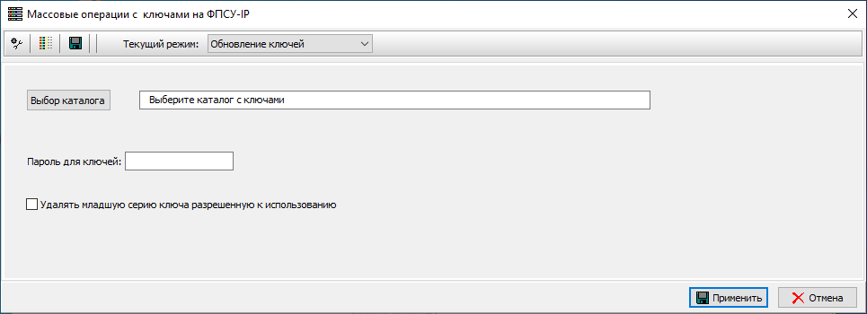 Для проведения массовых операций с ключами необходимо выбрать пункт меню «Операции» → «Массовые операции с ключами на ФПСУ-IP». В открывшемся окне «Массовые операции с ключами на ФПСУ-IP» следует указать путь к каталогу, в котором расположены файлы с ключевыми данными, выбрав путь в стандартном окне, открывающемся по нажатию кнопки «Выбор каталога».