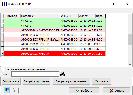 Для выбора ФПСУ-IP необходимо нажать кнопку «Выбор ФПСУ-IP» и в открывшемся окне отметить нужные ФПСУ-IP знаком Х в колонке «Выбор ФПСУ-IP». При необходимости можно выбрать все отображающиеся в списке ФПСУ-IP, выбрать только активные и\или только разрешенные ФПСУ-IP, а также найти необходимую запись путем ввода комбинации букв и\или цифр из названия ФПСУ-IP в поле поиска.