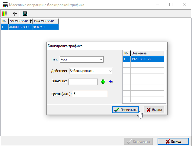 Для настройки трафика выбранного ФПСУ-IP необходимо выбрать пункт «Массовые операции с блокировкой трафика» меню «Операции». В открывшемся окне предоставляется возможность: