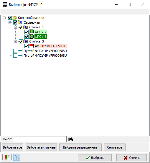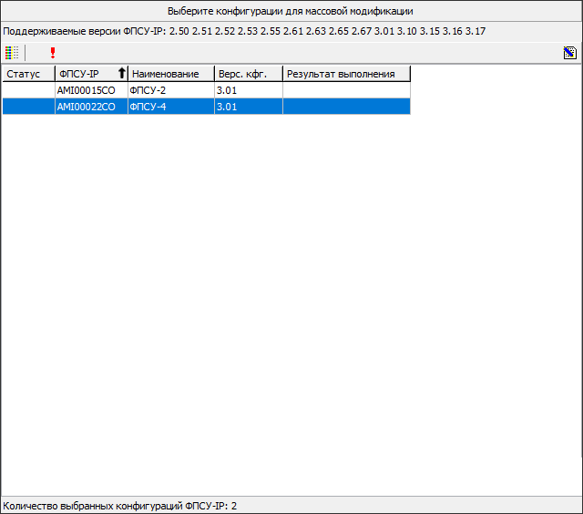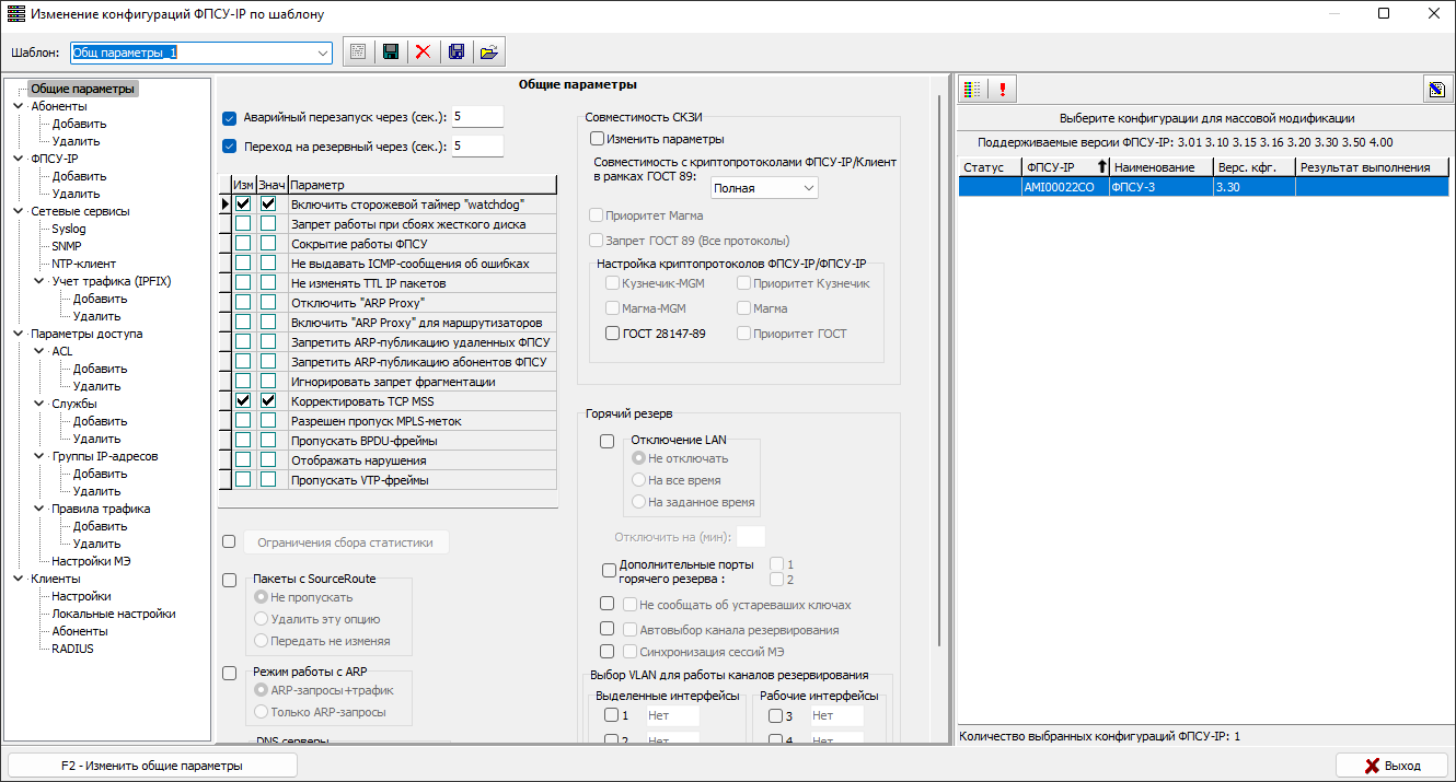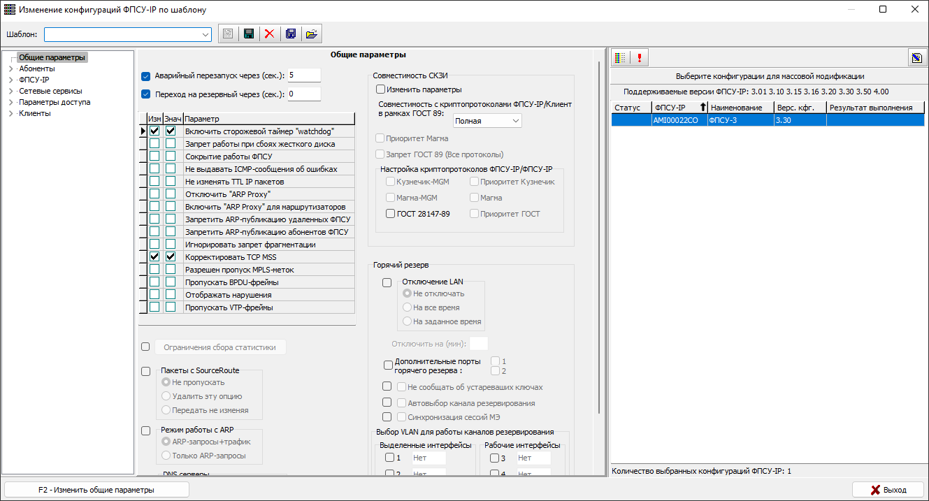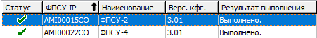 Для изменения конфигураций ФПСУ-2 и ФПСУ-4 в соответствии с шаблоном «Общ параметры_1» необходимо, чтобы конфигурации этих ФПСУ-IP были выбраны и отображались в списке, как показано на рисунке выше и в поле «Выбор шаблона» был выбран этот шаблон. По нажатию клавиши <F2> указанные в шаблоне изменения будут применены для конфигураций ФПСУ-2 и ФПСУ-4. В списке ФПСУ-IP будет отображаться статус и результаты изменения конфигураций.