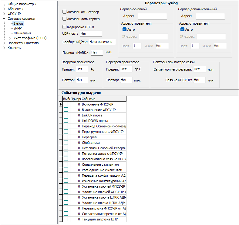 •UDP-порт — порт для отправления Syslog-сообщений от ФПСУ-IP Syslog-серверу, по умолчанию 514.