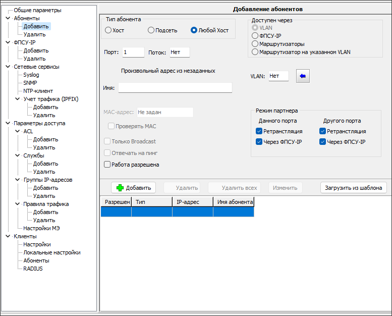 •«Тип абонента» - индивидуальный (адрес хоста), групповой (IP-адрес подсети) или специальный адрес «Любой хост». Остальные поля окна будут различными в зависимости от указанного типа адреса;