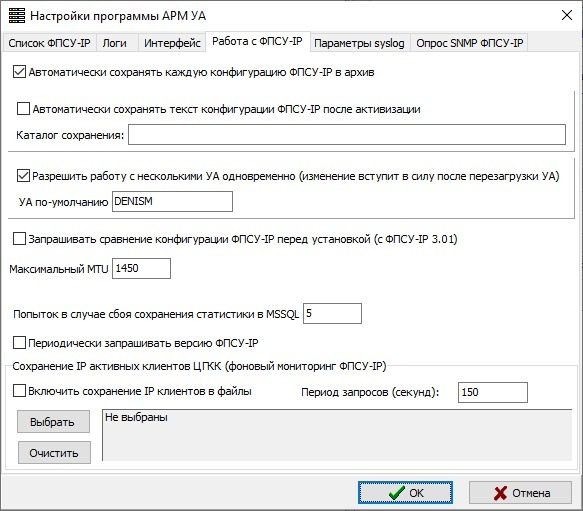 Режим работы УА ФПСУ-IP с несколькими администраторами УА ФПСУ-IP предполагает подключение к компьютеру VPN-Key/UA с учетными данными разных администраторов одновременно. Для настройки многопользовательского режима следует выбрать команду главного меню «Параметры» → «Настройки» и перейти на вкладку «Работа с ФПСУ-IP».