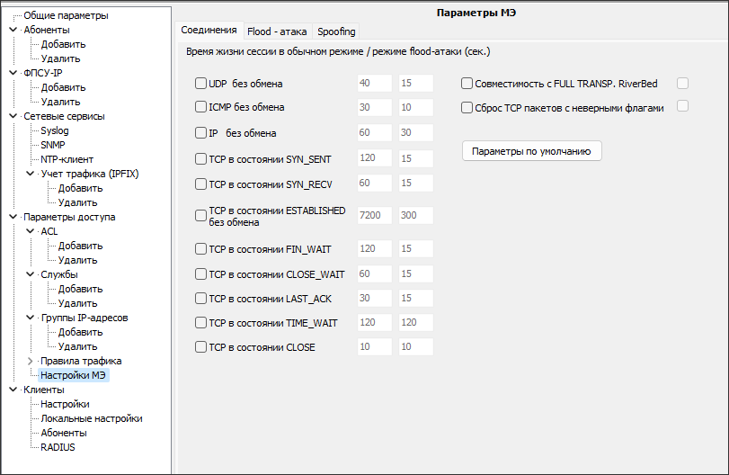 Окно состоит из трех вкладок. Первые две, «Соединения» и «Flood-атака», предназначены для настройки системы защиты ФПСУ-IP от атак отказа в обслуживании (flood-атак). Вкладка «Соединения» содержит установленные по умолчанию параметры работы межсетевого экрана ФПСУ-IP с IP/TCP/UDP соединениями в обычном режиме и в режиме после обнаружения атаки. Здесь настраиваются таймауты, по истечению которых неактивное соединение будет удалено из внутренней таблицы контроля соединений межсетевого экрана. Указывается два типа таймаутов – время удаления записи о соединении из таблицы при штатном режиме работы ФПСУ-IP (первый столбец), и время обнаружения атаки отказа в обслуживании (второй столбец). Учитываются таймауты удаления из таблицы контроля соединения межсетевого экрана для следующих типов соединений: •UDP без обмена – соединением в этом случае считается трафик между уникальными UDP портами разных IP-адресов абонентов ФПСУ-IP. В случае отсутствия UDP-трафика по указанным портам, по таймауту запись о соединении удаляется из таблицы; •ICMP без обмена – соединением в этом случае считается ICMP обмен между двумя абонентами ФПСУ-IP. В случае отсутствия обмена ICMP-сообщениями в течение указанного таймаута, запись о соединении удаляется из таблицы; •IP без обмена – соединением в этом случае считаются все прочие виды трафика между двумя абонентами, не являющиеся TCP, UDP или ICMP. Запись удаляется из таблицы по таймауту при отсутствии новых обменов; •TCP в состоянии … – учитывается каждое соединение с разными TCP портами отправителя и получателя между любой парой абонентов ФПСУ-IP. По таймауту запись будет удалена из таблицы, и дальнейшее взаимодействие между этой парой абонентов должно будет начаться с повторного установления TCP-соединения. Новые пакеты, не относящиеся к установлению TCP-соединения, после удаления записи из таблицы будут сброшены. Для каждого состояния TCP-соединения используется одна запись в таблице контроля соединений межсетевого экрана ФПСУ-IP, но таймауты различаются. •Совместимость с FULL TRANSP. RiverBed – флаг, активирующий на ФПСУ-IP механизм совместимости с оптимизаторами трафика RiverBed, которые отклоняются от стандартных схем работы TCP-соединений (в том разрешение на пропуск ACK без данных). •Сброс TCP-пакетов с неверными флагами – флаг, указывающий межсетевому экрану ФПСУ-IP сбрасывать пакеты, в IP-заголовке которых обнаружены некорректные (не соответствующие рекомендуемым RFC) комбинации флагов протокола TCP. Вкладка «Flood-атака» содержит параметры, по которым ФПСУ-IP определяет начало атаки в свои адреса или адреса защищаемых абонентов и управляет списком заблокированных IP-адресов. Следует учитывать, что ФПСУ-IP безусловно переходит в режим защиты от flood-атаки, если оперативная память ФПСУ-IP загружается на 100%. В режиме защиты от flood-атаки ФПСУ-IP использует тайминги удаления соединений, указанные во вкладке Соединения, а также заносит в стоп-лист IP-адреса абонентов, передающих больше пакетов в секунду, чем разрешено настройками.