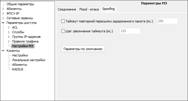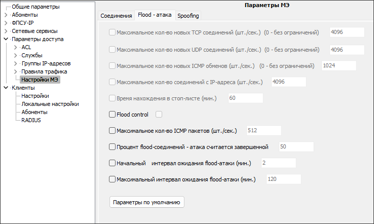 ФПСУ-IP переходит в режим защиты от атаки, если превышен хотя бы один из следующих критериев: •Максимальное кол-во новых TCP соединений (шт./сек.) – количество новых, то есть отсутствующих в таблице контроля соединений межсетевого экрана, TCP- соединений в секунду; •Максимальное кол-во новых UDP соединений (шт./сек.) – количество новых, то есть между новыми парами IP-адрес: UDP-порт, UDP- обменов в секунду; •Максимальное кол-во новых ICMP обменов (шт./сек.) – количество новых ICMP- обменов в секунду; •Максимальное кол-во новых ICMP пакетов (шт./сек.) – общее количество ICMP эхо-запросов (и только эхо-запросов) в секунду. Во время защиты от flood-атаки, ФПСУ-IP начинает считать количество пакетов в секунду, отправленных с IP-адресов абонентов. Если это число превышает параметр «Максимальное кол-во соединений с IP-адреса (шт./сек.)», то этот IP-адрес заносится в стоп-лист, то есть все исходящие от него пакеты будут блокироваться. •Анти-флуд включен. Если флаг «Flood control» установлен, то IP-адрес будет находится в стоп-листе в течение времени, указанного в поле «Время нахождения в стоп-листе (мин.)». Если флаг «Flood control» не установлен, то IP-адрес будет находится в стоп-листе до перезагрузки ФПСУ-IP. Флаг «Flood control» влияет на активность параметров «Максимальное кол-во новых TCP соединений (шт./сек.)», «Максимальное кол-во новых UDP соединений (шт./сек.)», «Максимальное кол-во новых ICMP обменов (шт./сек.)», «Максимальное кол-во соединений с IP-адреса (шт./сек.)». Если флаг снят, то ФПСУ-IP будет переходить в режим защиты от flood-атаки только в случаях полной загрузки оперативной памяти и в случае превышения порога ICMP эхо-запросов. •На момент начала атаки ФПСУ-IP запоминает общее количество всех типов соединений – это значение потребуется для определения времени завершения атаки. Для начала выхода ФПСУ-IP из режима защиты от flood-атак, общее количество соединений сначала должно упасть до указанной в поле «Процент flood-соединений – атака считается завершенной» доли соединений, по сравнению с количеством соединений на начало атаки. •После первоначального уменьшения соединений до процентного значения, указанного в поле «Процент flood-соединений – атака считается завершенной», ФПСУ-IP запускает таймер обратного отсчета, с указанным в поле «Начальный интервал ожидания flood-атаки (мин.)» значением. Если в течение этого времени общее количество соединений не поднялось обратно выше порога, то атака считается завершенной и ФПСУ-IP переходит в обычный режим работы. •Если общее количество соединений за указанное время превысило пороговое значение, то ФПСУ-IP остается в режиме защиты от flood-атаки, таймер увеличивается в полтора раза и запускается заново. Максимальное значение таймера указывается в поле «Максимальный интервал ожидания Flood-атаки (мин.)». Вкладка «Spoofing» содержит параметры, отвечающие за работу ФПСУ-IP c TCP-соединениями в режиме spoofing на медленных каналах связи.