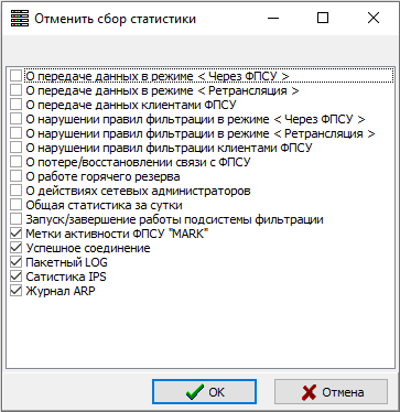 oФлаг «Аварийный перезапуск». Если при работе ФПСУ-IP происходит аппаратный сбой сетевых адаптеров, ФПСУ-IP способен детектировать это событие и выдать на экран монитора специальное сообщение, сопровождающееся звуковым сигналом, после чего через некоторое время ПО сетевых адаптеров и ПО ФПСУ-IP автоматически перегрузятся, после чего и ФПСУ-IP попытается восстановить работу режима фильтрации пакетов. В диалоговом поле строки укажите время, в течение которого будет выдаваться сообщение перед перезагрузкой (в диапазоне от 5 секунд до 1 часа). Если автоматический перезапуск не нужен (например, необходимо ознакомиться с диагностикой неполадок, выданной на экран монитора), оставьте поле пустым; в таком случае при возникновении аппаратного сбоя сообщение, сопровождаемое звуковым сигналом, будет выдаваться до его отмены администратором при локальном управлении. •Флаг «Переход на резервный». Если при работе ФПСУ-IP получает сигнал от сетевой аппаратуры об отсутствии физического соединения на каком-либо из рабочих портов, ФПСУ-IP может передать управление партнеру по системе горячего резервирования. В диалоговом поле строки укажите время, по истечении которого будет задействован резервный ФПСУ-IP (в диапазоне от 5 до 255 секунд), или оставьте поле пустым, если такая операция не требуется. •Список параметров. Выбрать параметр для изменения можно, установив флаг в столбце «Изм» в строке параметра, и указав значение параметра - установленный флаг в столбце «Знач» означает, что опция активирована. Подробное описание параметров приведено в руководствах «Программно-аппаратный комплекс «ФПСУ-IP 3.X» и «Криптомаршрутизатор и межсетевой экран «ФПСУ Amigo» версии 4.0.1. Руководство по эксплуатации» в пункте «Общие параметры конфигурации ФПСУ-IP». •«Ограничения по сбору статистики». Установленный флаг активирует одноименную кнопку, нажатие на которую позволяет наложить ограничения на сбор регистрационной информации ФПСУ-IP: