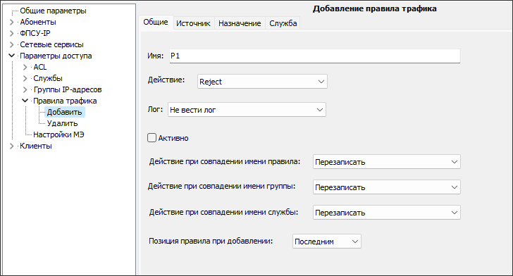 Правило трафика применяется только к тем пакетам, IP-адреса источника и назначения которых указаны в соответствующих вкладках. Исключение: если во вкладках «Источник» и «Назначение» нет ни одной записи (список пуст), то правило трафика применяется ко всем пакетам. Вкладка «Службы» позволяет ограничить действие правила не ко всем пакетам, а только тем, которые используют указанные в списке этой вкладки протоколы (службы). Для подробного рассмотрения правил управления трафиком рекомендуется ознакомиться с руководством по эксплуатации ФПСУ-IP.