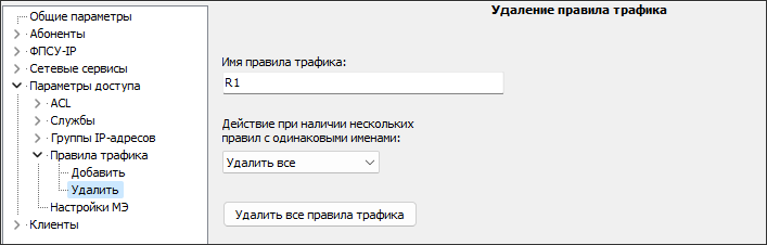 При выборе режима в поле «Имя правила трафика» отображается название последнего удаленного правила. В поле «Имя правила трафика» указывается полное название правила с учетом регистра символов, в данном поле не поддерживается режим автозаполнения. При необходимости следует задать действие при наличии нескольких правил с указанным именем и удалить правило по нажатию клавиши <F2>.