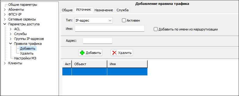 •Флаг «Активен». Каждая запись добавляется в список вкладок Источник или Назначение в состоянии активна или не активна. Если флаг снят, то объект будет добавлен в список, но правило трафика по нему отрабатывать не будет.